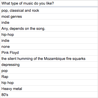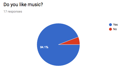 The first question in the music category was 'do you like music?'. 1 people said yes and 1 person said no. The second question i asked was 'what type of music do you like?'. I got a lot of different results but the genres that go multiple votes where pop, hip-hop, heavy metal, indie and some people said any.