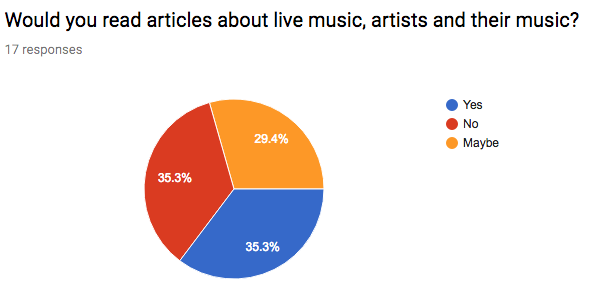 The final question in this section is 'Would you read articles about live music, artists and their music?'. 5 people voted maybe, 6 people voted no and 6 people said yes. This was an important question as that is what my magazine is based on and if the audiences didn't like it then i wouldn't be successful.