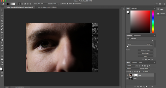 Here i have moved the picture of Nelson's eye on top of the bridge background and unlocked the background as well as adding a mask to layer 1. I am trying to add a gradient to the mask, but when i do it it doesn't work.